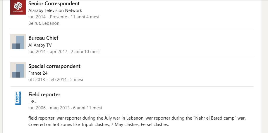 Dal Canale libanese LBC , ad una esperienza di corrispondente per la tv all news francese France 24, da 11 anni lavora all’emittente Al Araby, dove occupa un posto di rilievo.